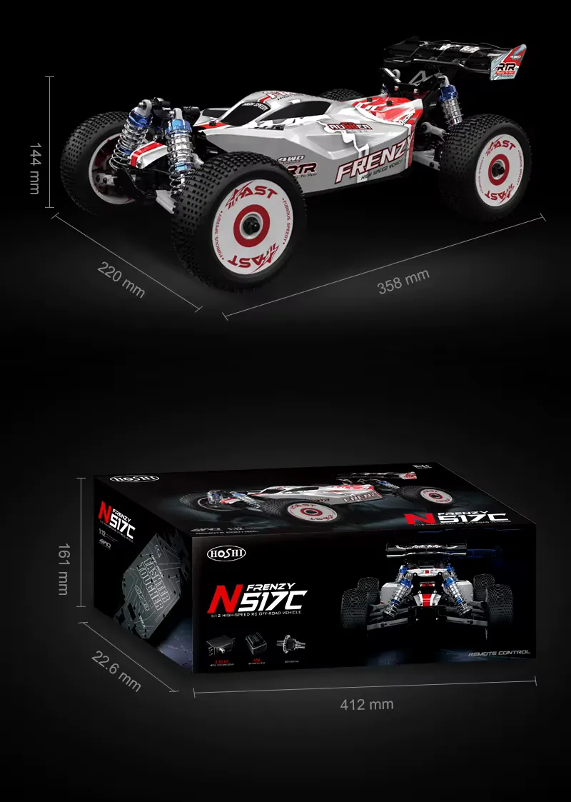 Masina cu telecomanda profesionala pentru curse, Hoshi N517C 4WD este un model de mare viteza conceput pentru performanta si control precis pe teren off-road. Cu un design robust si componente de nivel avansat, este ideala pentru utilizatorii care vor o experienta realista de curse RC.