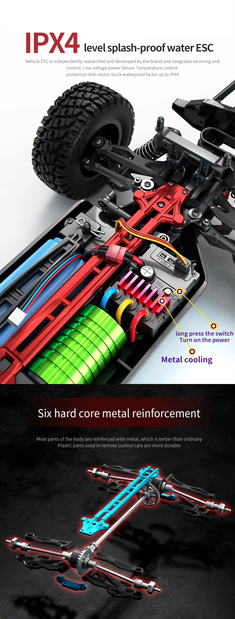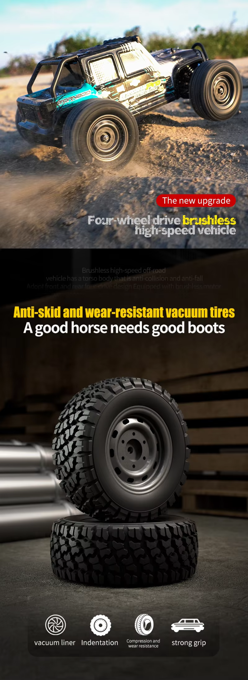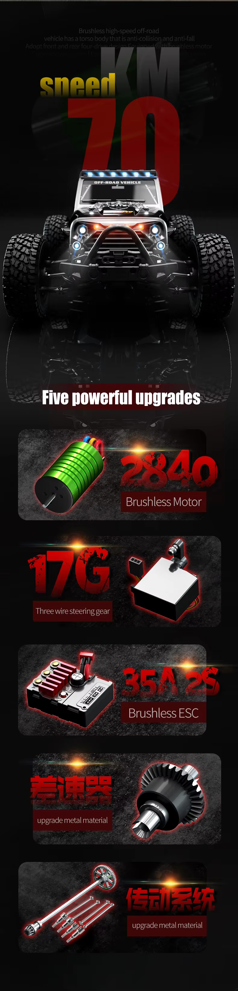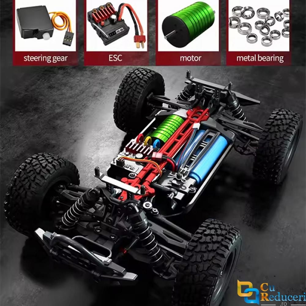 Motorul brushless fara perii 2840 ofera accelerare rapida, eficienta si durata de viata lunga, facand masina ideala pentru curse de viteza si off-road.