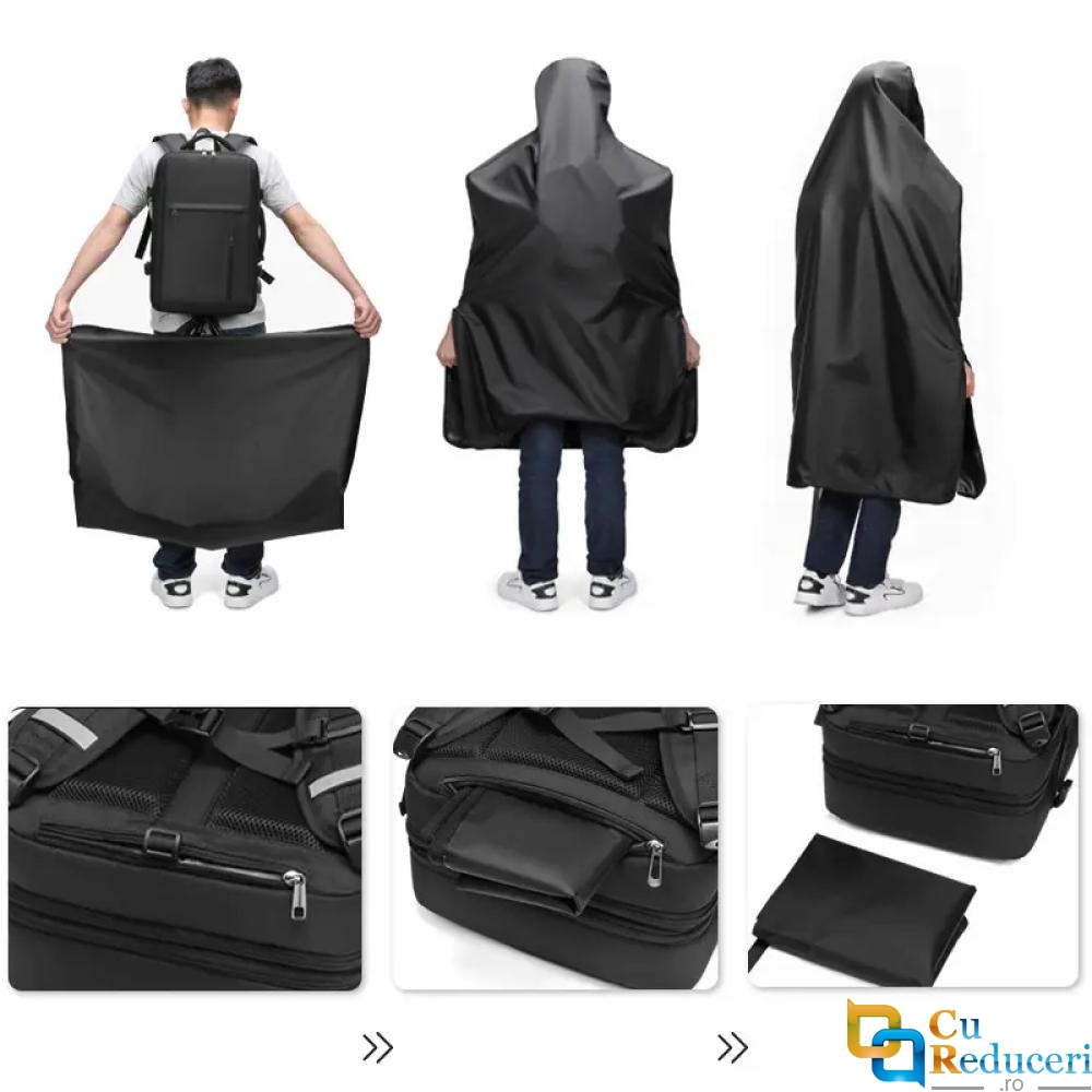 Rucsacul este echipat cu un port USB integrat, permitandu-ti sa incarci dispozitivele electronice in timp ce te deplasezi, si dispune de un sistem de deschidere la 180 de grade pentru acces rapid si facil la continut. Pelerina impermeabila incorporata si buzunarul interior impermeabil adauga un nivel suplimentar de protectie impotriva ploii si a umezelii.