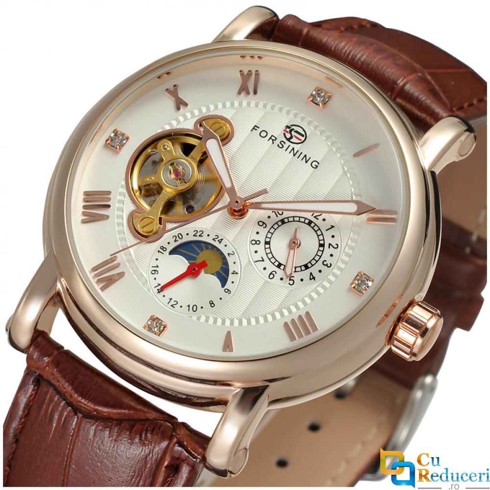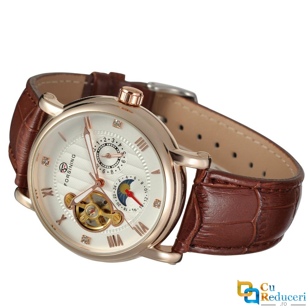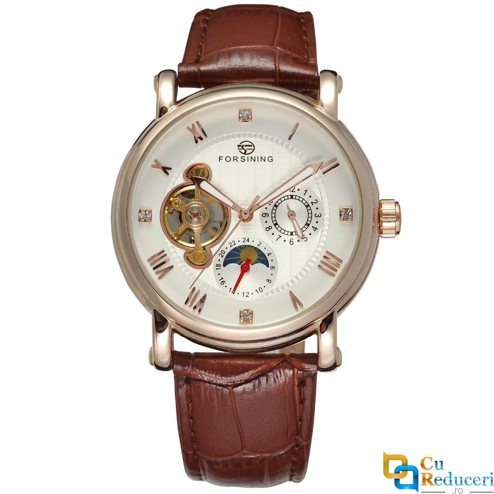Ceas barbatesc Forsining cu Moon Phase (arata noapte/zi), curea din
