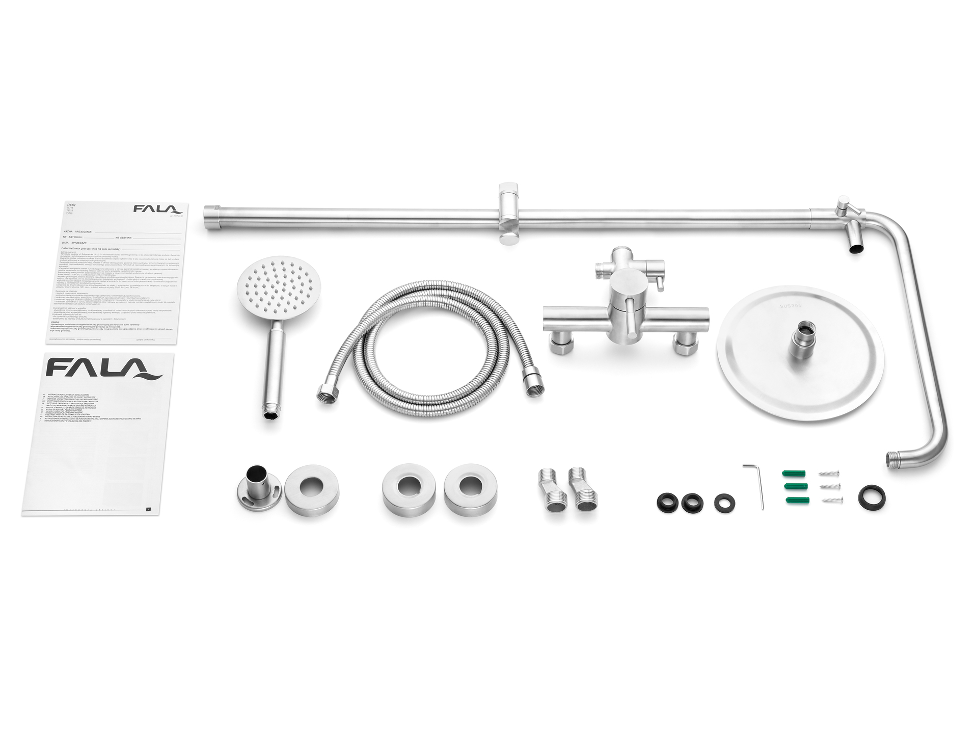 Setați conținutul: baterie | cap de duș | furtun de dus cu garnituri | duș cu ploaie | tija de dus | came cu rozete și sigilii