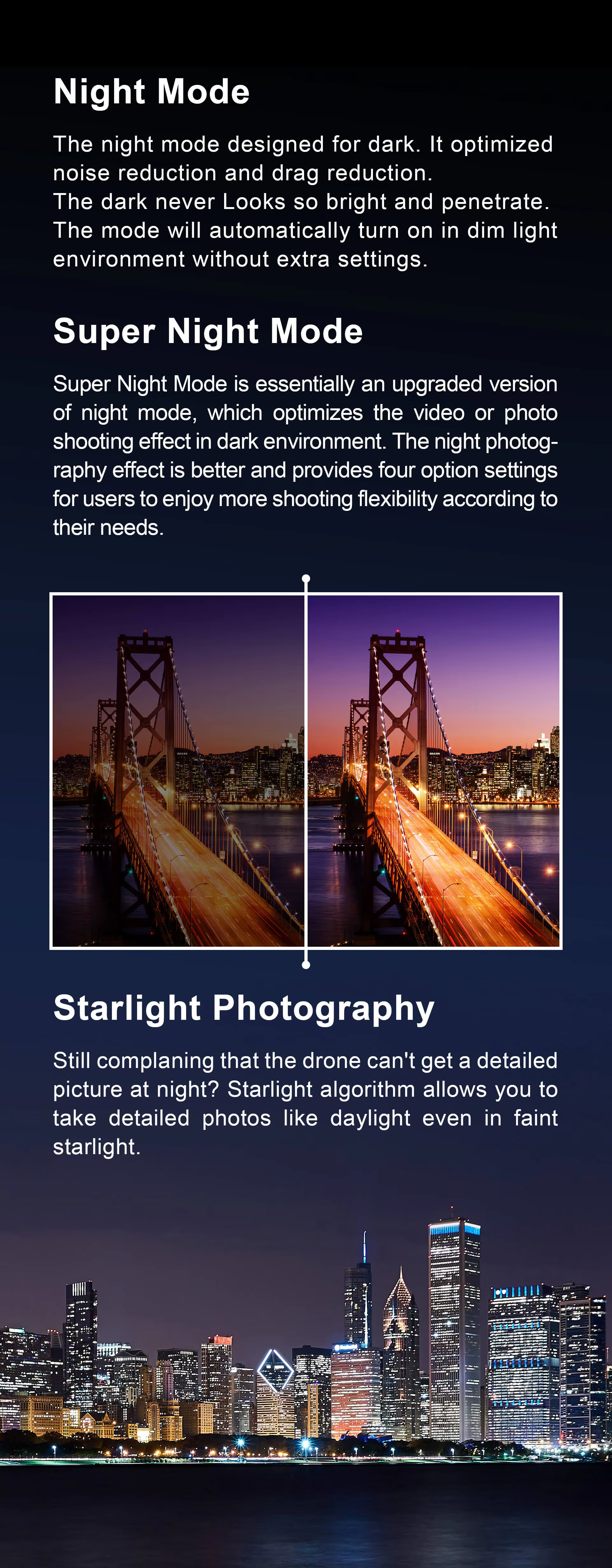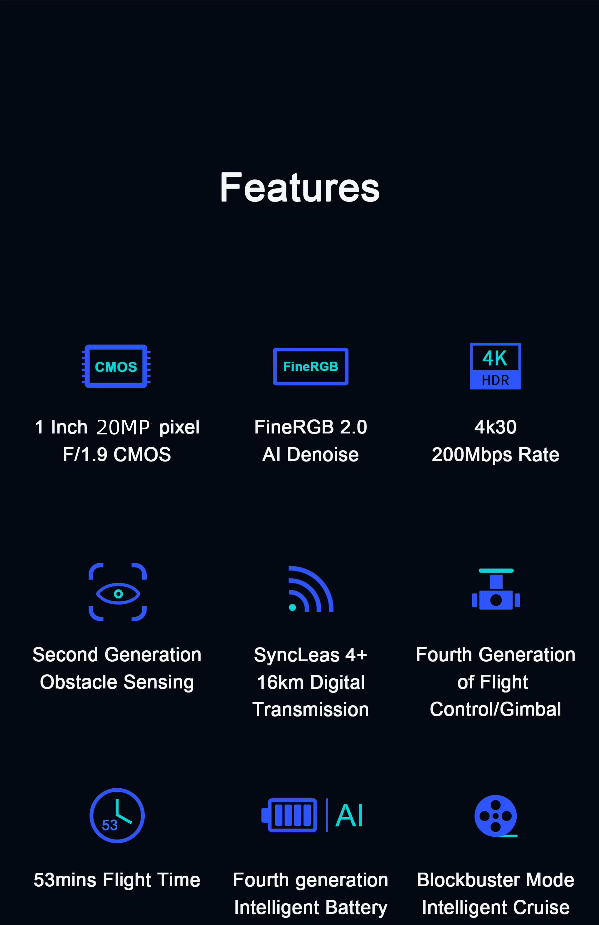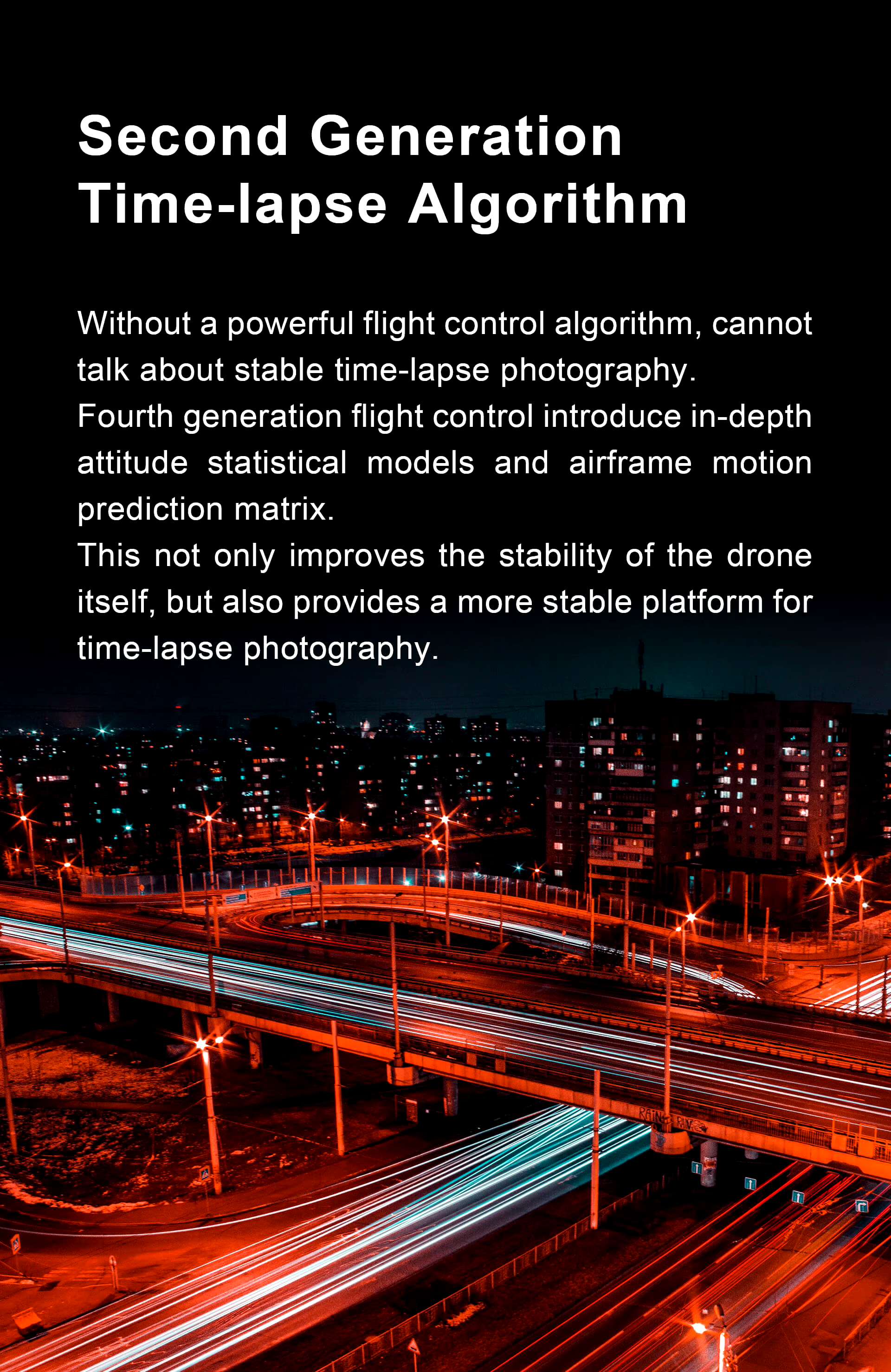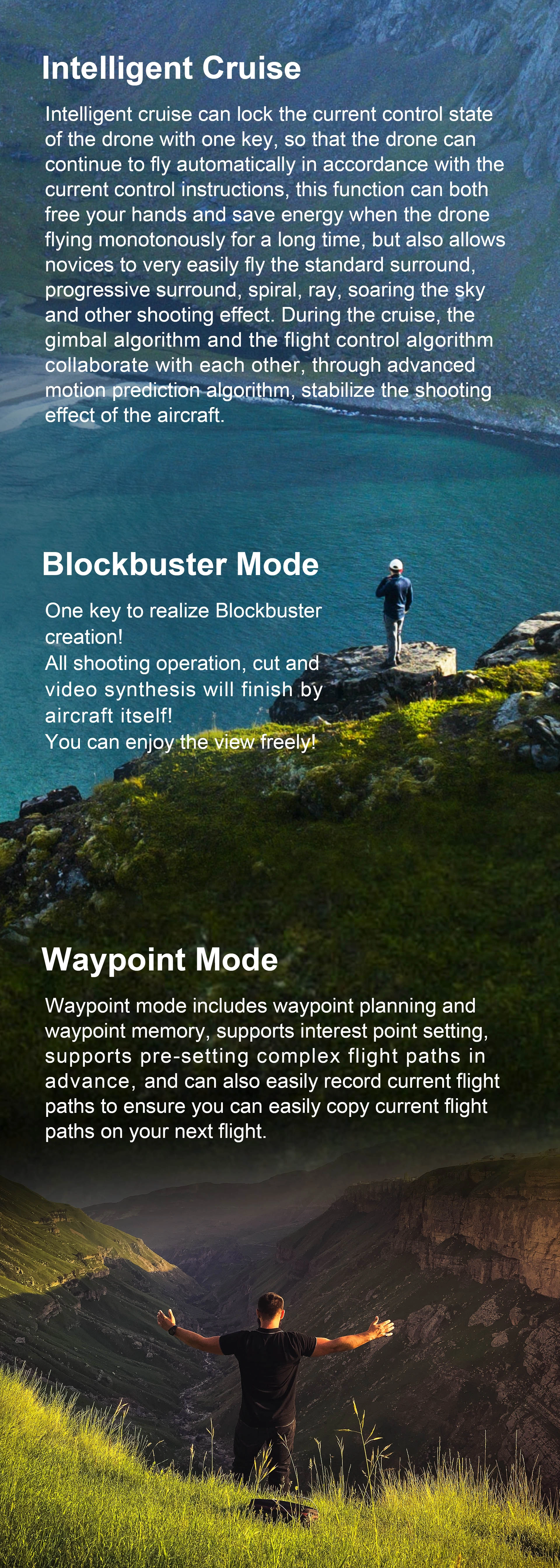 Cu functia de urmarire a dronei va capta fiecare miscare in mod automat. In plus, timpul de zbor de 45- 53minute si sistemul de control de la distanta de 16000 m va conduce la o experienta de zbor minunata. Drona face filmarea mult mai usoara si profesionala, ceea ce este o alegere buna pentru pasionatii de fotografie aeriana.