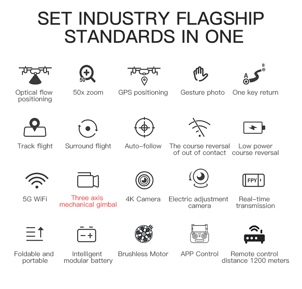 Cu functia de urmarire drona va capta fiecare miscare in mod automat. In plus, timpul de zbor de 26 minute si sistemul de control de la distanta de 1200m va conduce la o experienta de zbor minunata. Drona face filmarea mult mai usoara si profesionala, ceea ce este o alegere buna pentru pasionatii de fotografie aeriana.