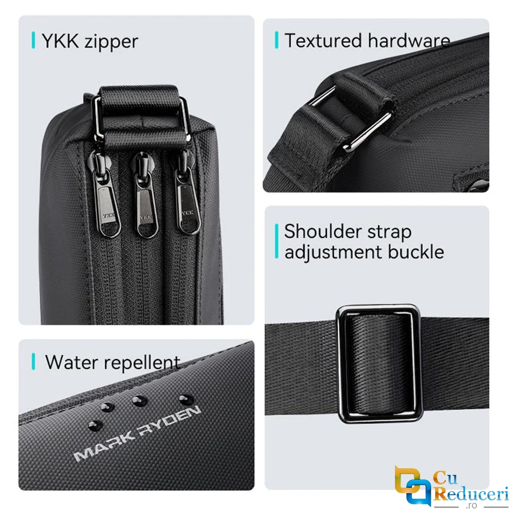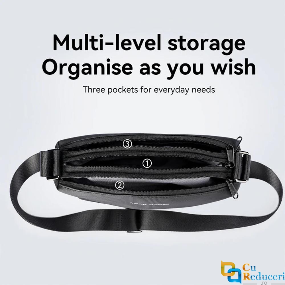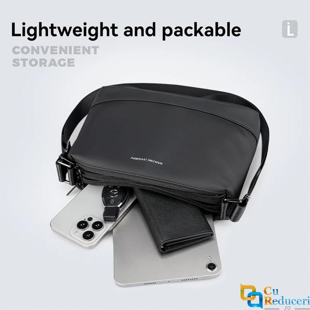 Geanta crossbody Mark Ryden MR105 este cunoscuta si sub denumirea de "Easypose", fiind gandita pentru confort si functionalitate. Materialul Oxford de inalta calitate asigura durabilitate si rezistenta in timp, iar protectia impermeabila mentine obiectele personale in siguranta indiferent de vreme. Compartimentele multiple faciliteaza organizarea eficienta, iar greutatea redusa de doar 0,25 kg face ca aceasta geanta sa fie extrem de practica si usor de purtat zilnic.
