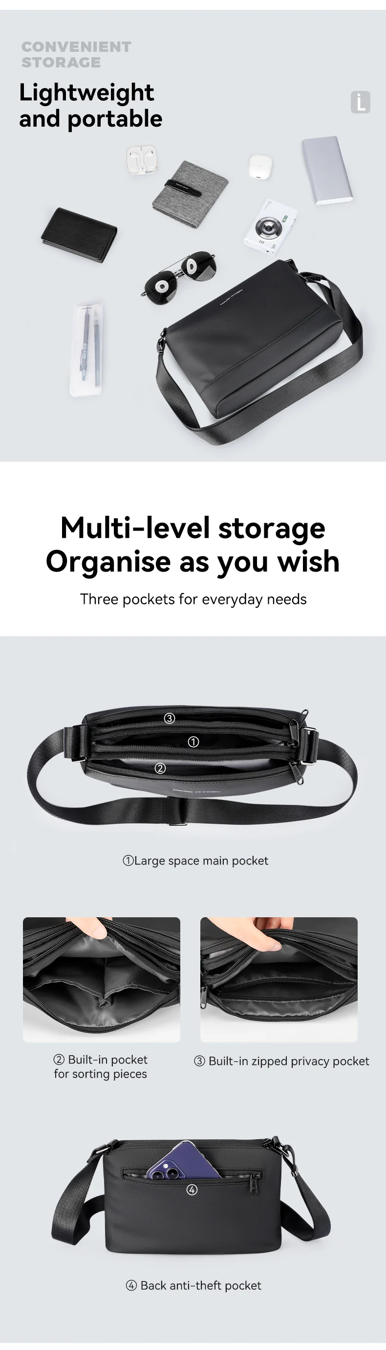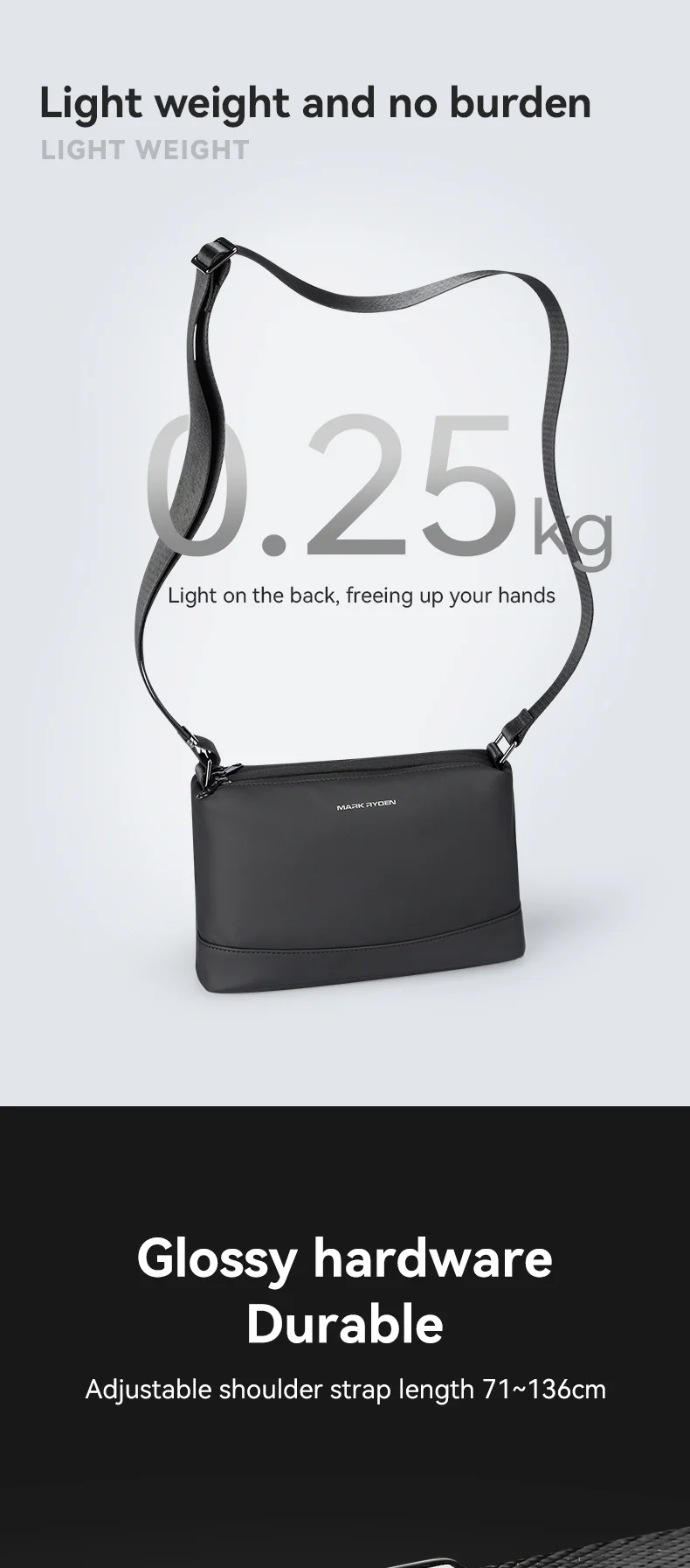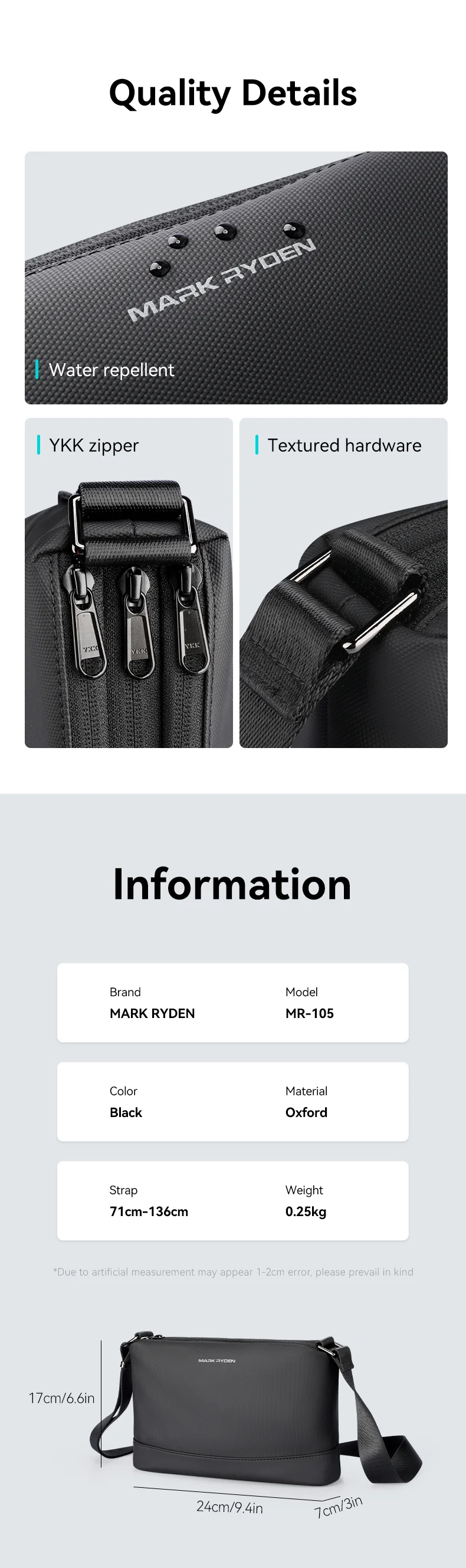 Geanta crossbody Mark Ryden MR105 este cunoscuta si sub denumirea de "Easypose", fiind gandita pentru confort si functionalitate. Materialul Oxford de inalta calitate asigura durabilitate si rezistenta in timp, iar protectia impermeabila mentine obiectele personale in siguranta indiferent de vreme. Compartimentele multiple faciliteaza organizarea eficienta, iar greutatea redusa de doar 0,25 kg face ca aceasta geanta sa fie extrem de practica si usor de purtat zilnic.