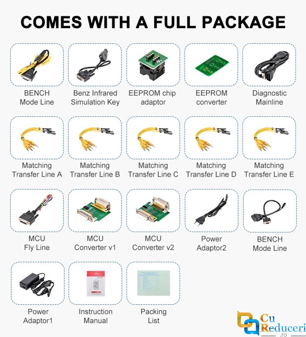 ECU/TCU clonare si inlocuire: pentru platforme moderne (ex: VW/Audi MQB, BMW, Mercedes etc.), suporta clonare sau inlocuire ECU/TCU fara demontarea completa, in unele cazuri.