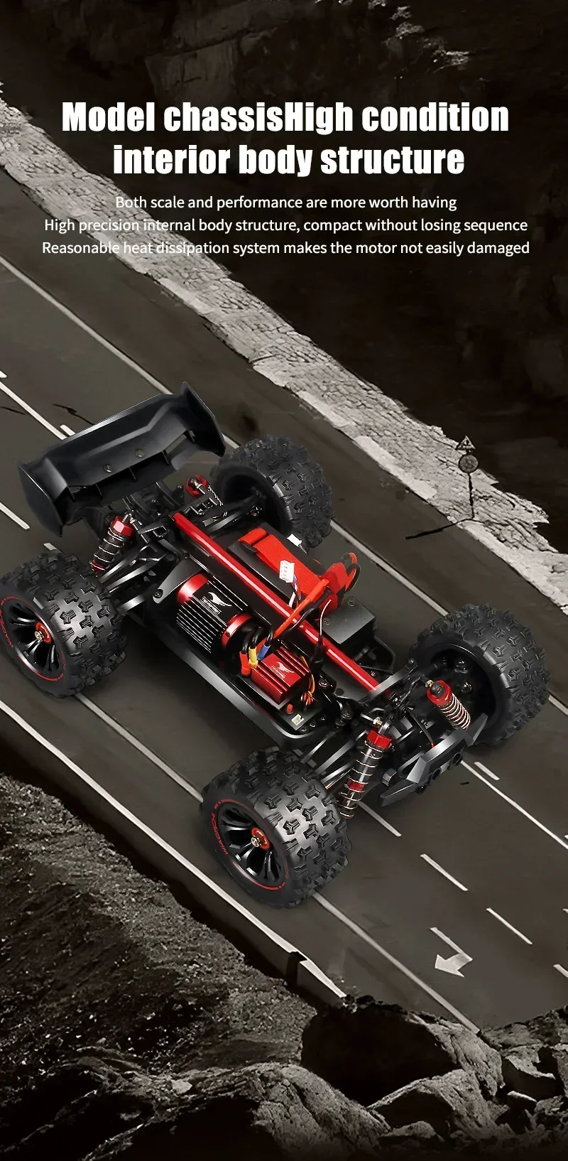 Masina cu telecomanda 9522 PRO este un model RC de inalta performanta, proiectat pentru pasionatii de viteza, control precis si terenuri dificile. Acest model in scara 1:16 vine echipat cu un motor brushless de tip 2845 cu o putere impresionanta de 4000Kv, oferind acceleratie rapida si o viteza maxima de pana la 85 km/h. Este ideala pentru terenuri accidentate, dar la fel de spectaculoasa si pe asfalt, iar manevrabilitatea sa este remarcabila datorita tractiunii integrale 4x4 si suspensiei independente pe toate cele patru roti.