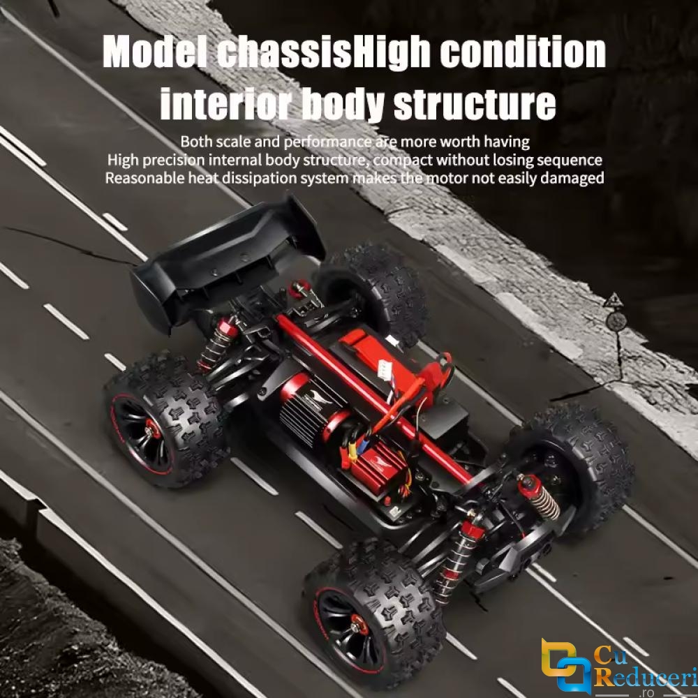 In interior, masina este echipata cu angrenaje metalice si rulmenti cu bile, ceea ce contribuie la o transmisie fiabila si o durata de viata indelungata. Toate aceste caracteristici tehnice sunt ambalate intr-un model compact si robust, care masoara aproximativ 33 x 23 x 13 cm si ofera o experienta RC premium intr-un format accesibil.
