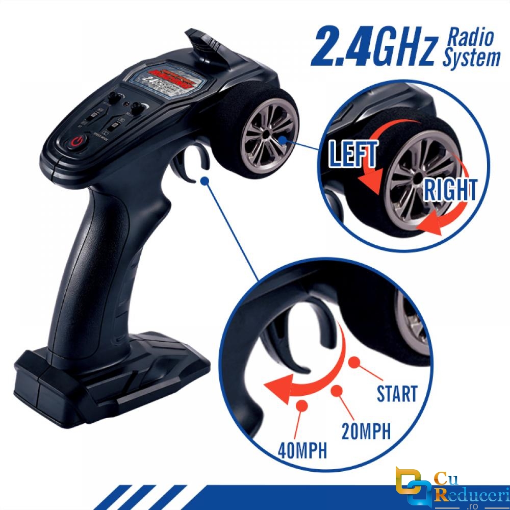 Sistemul radio de 2.4 GHz cu receptor rezistent la apa permite sa concureze in acelasi timp pe aceeasi pista.