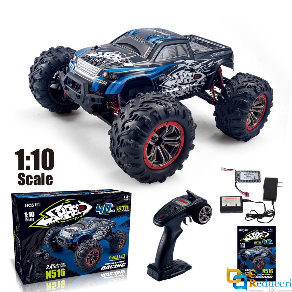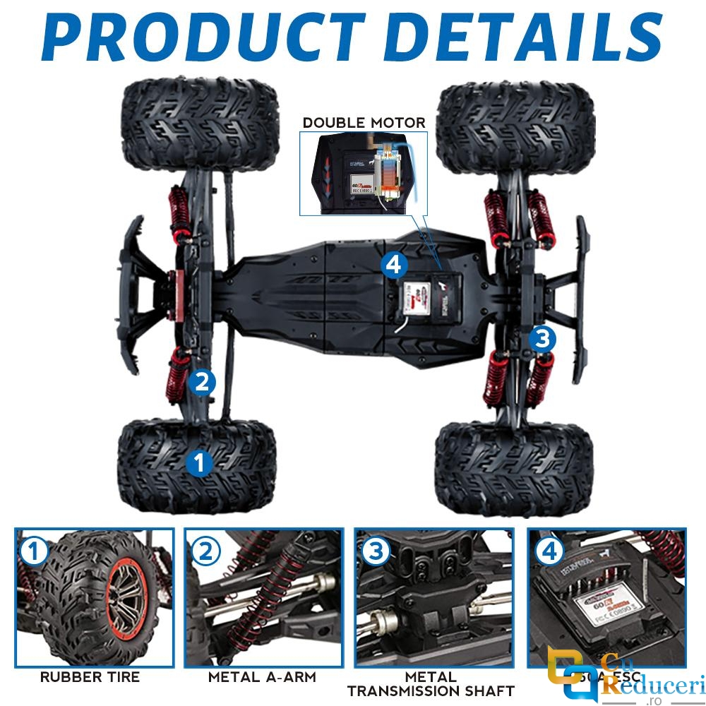 Rezistent la apa, rapid, motor de putere mare, controler electronic periat (cu baterie cu litiu de 7.4V 1600mAh), sistem puternic de alimentare care face masina sa functioneze continuu 10-15 minute.