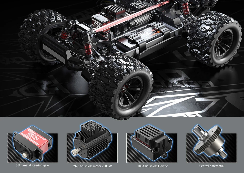 Cu o telecomanda wireless pe 2.4 GHz, ai control complet pe o raza de pana la 120 metri, fara interferente. Sistemul de directie si acceleratie este fin reglat, oferindu-ti o experienta fluida si dinamica in fiecare cursa. Masina este alimentata de o baterie puternica 4S 14.8V 5000 mAh inclusa, care permite sesiuni de rulare de 15-20 minute la performanta maxima. Incarcarea completa dureaza aproximativ 2 ore, ceea ce o face ideala pentru ture frecvente si intense. Angrenajele metalice adauga durabilitate si rezistenta in timp, chiar si la utilizare extrema. Sistemul ESC independent de 100A sustine cu usurinta motorul brushless, permitand acceleratii rapide si o reactie precisa in orice situatie. Masina este pregatita pentru actiune si pe timp de seara, fiind dotata cu lumini LED ce ofera un aspect impresionant si vizibilitate sporita. Cu o greutate solida de 4.2 kg si dimensiuni generoase (449 x 343 x 213 mm), acest model este construit sa impresioneze atat prin prezenta, cat si prin performanta.
