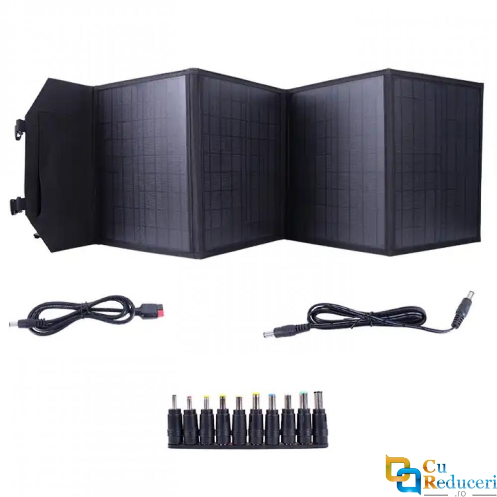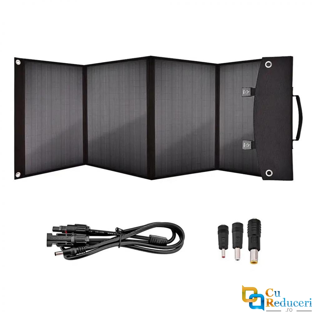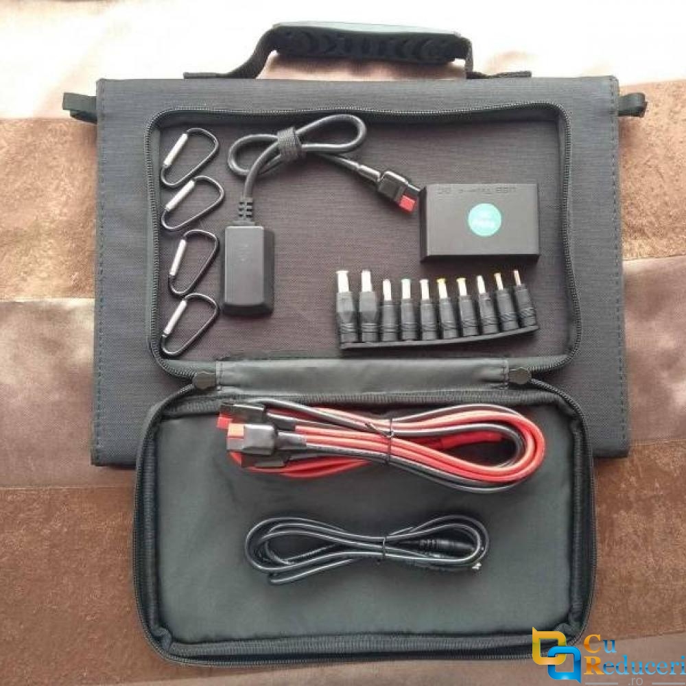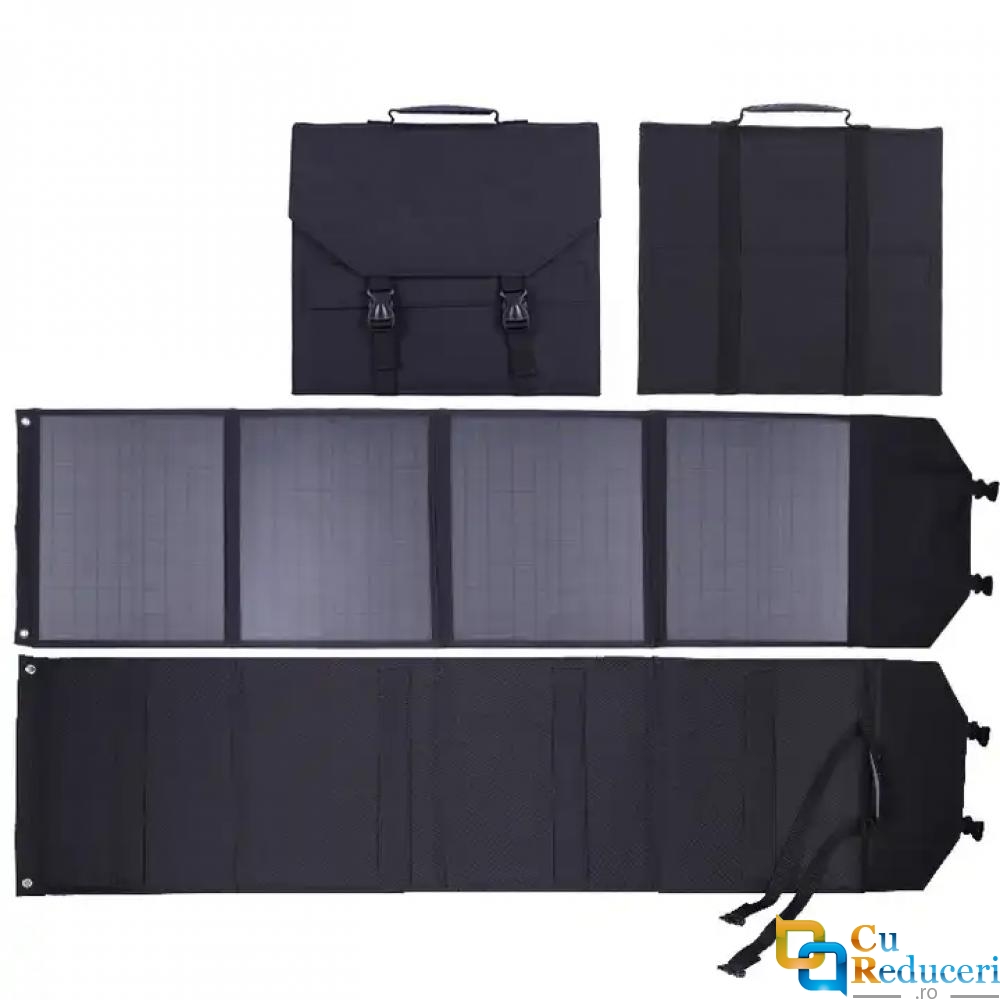 Acest panou este proiectat cu un maner din cauciuc si un suport. Acesta poate fi apoi montat si mentinut la un unghi de 45 de grade, ceea ce produce eficienta energetica maxima. Designul pliabil si portabil nu face decat sa-si imbunatateasca capacitatea de a fi transportat cu succes prin activitatile in aer liber.