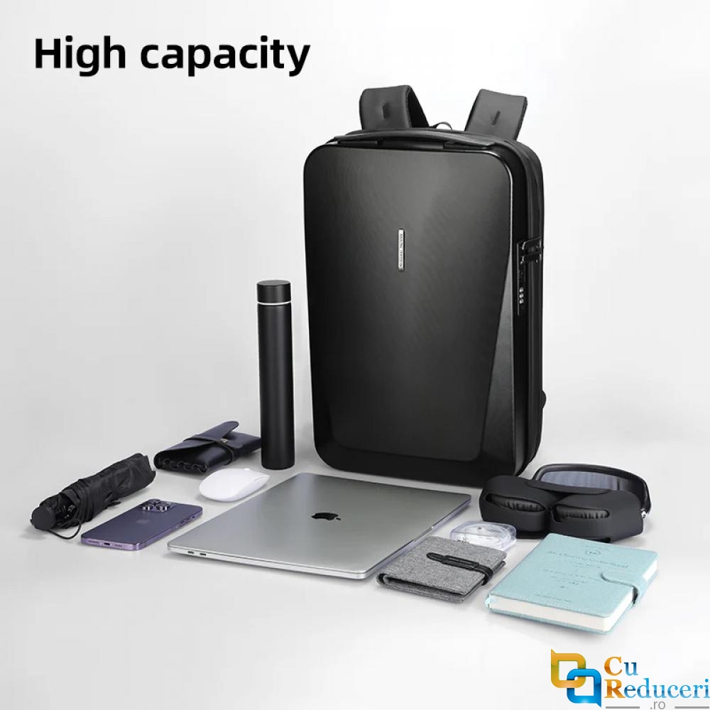 Fabricat din materiale de inalta calitate, rucsacul combina tesatura Oxford impermeabila cu o carcasa rigida din ABS, oferind o rezistenta sporita la uzura si socuri. Suprafata sa exterioara protejeaza continutul impotriva apei si a murdariei, fiind perfecta pentru utilizare in orice conditii meteorologice.