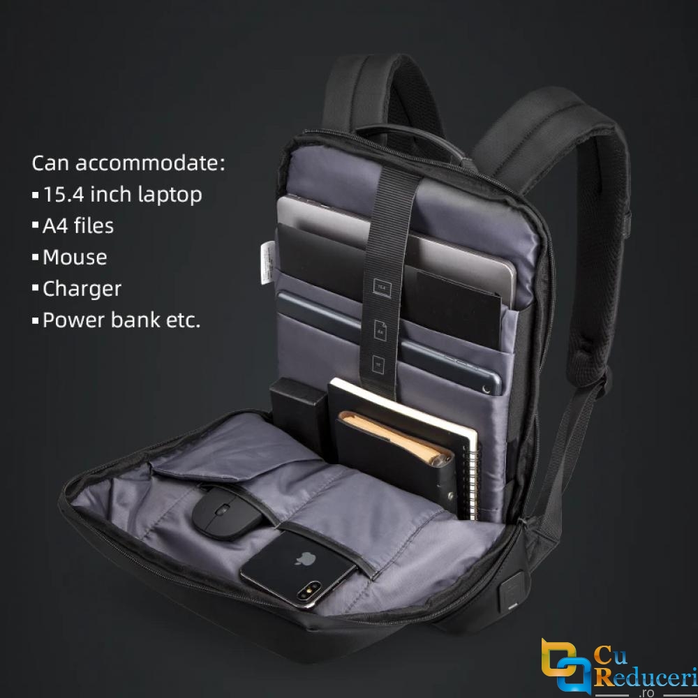 Multifunctional - Rucsacul Kingsons KS3210W prezinta un compartiment central cu fermoar, in care in partea frontala se afla doua buzunare deschise iar in partea din spate este dotat cu trei buzunare dedicate pentru laptop si tableta asigurate cu banda cu sky si un buzunar inchis cu capsa. Rucsacul mai prezinta un buzunar frontal cu port chei inchis cu fermoar, un buzunar lateral inchis cu fermoar, un buzunar antifurt cu fermoar in partea din spate, un buzunar pentru caduri cu fermoar in bareta, o gaica pentru agatat ochelarii pe bareta si un port USB extern cu cablu de incarcare incorporat (nu este inclusa bateria, aveti nevoie de un acumulator extern pentru a va incarca telefonul).