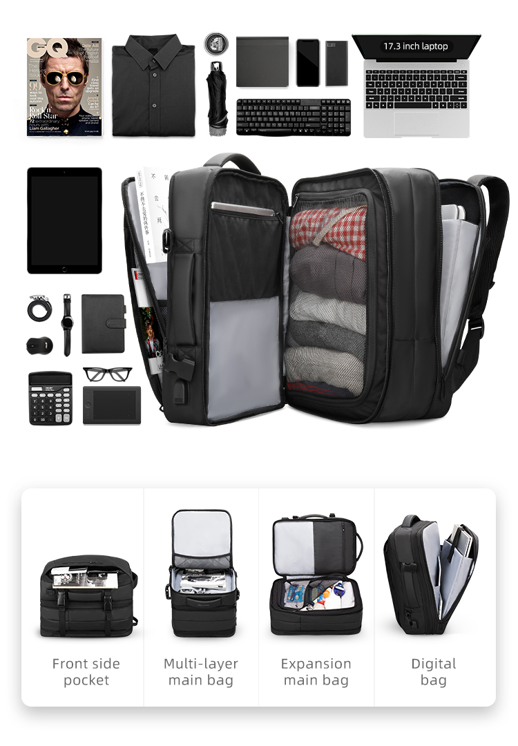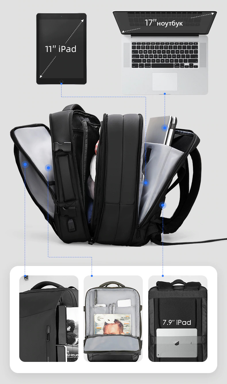 In primul compartiment frontal mare, exista un organizator, aici puteti plasa si un poverbank pentru incarcarea rapida si comoda a unui smartphone printr-un port USB extern. A doua ramura - „transformator” pentru obiecte personale, imbracaminte si alte lucruri. Poate fi aproape plat sau extinde la dimensiunea unei valize mici. Trebuie doar sa desfaci fermoarul circular. Al treilea compartiment este conceput pentru tehnologie si chiar un laptop cu diagonala de 17 inci se va potrivi acolo. Si, bineinteles, merita remarcat materialele premium pentru decorarea interiorului, accesoriile fiabile SBS, spatarul ortopedic si captuselile moi ventilate pe curele. In plus, acestea din urma au fixare transversala suplimentara.