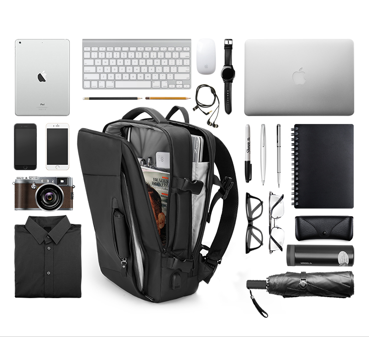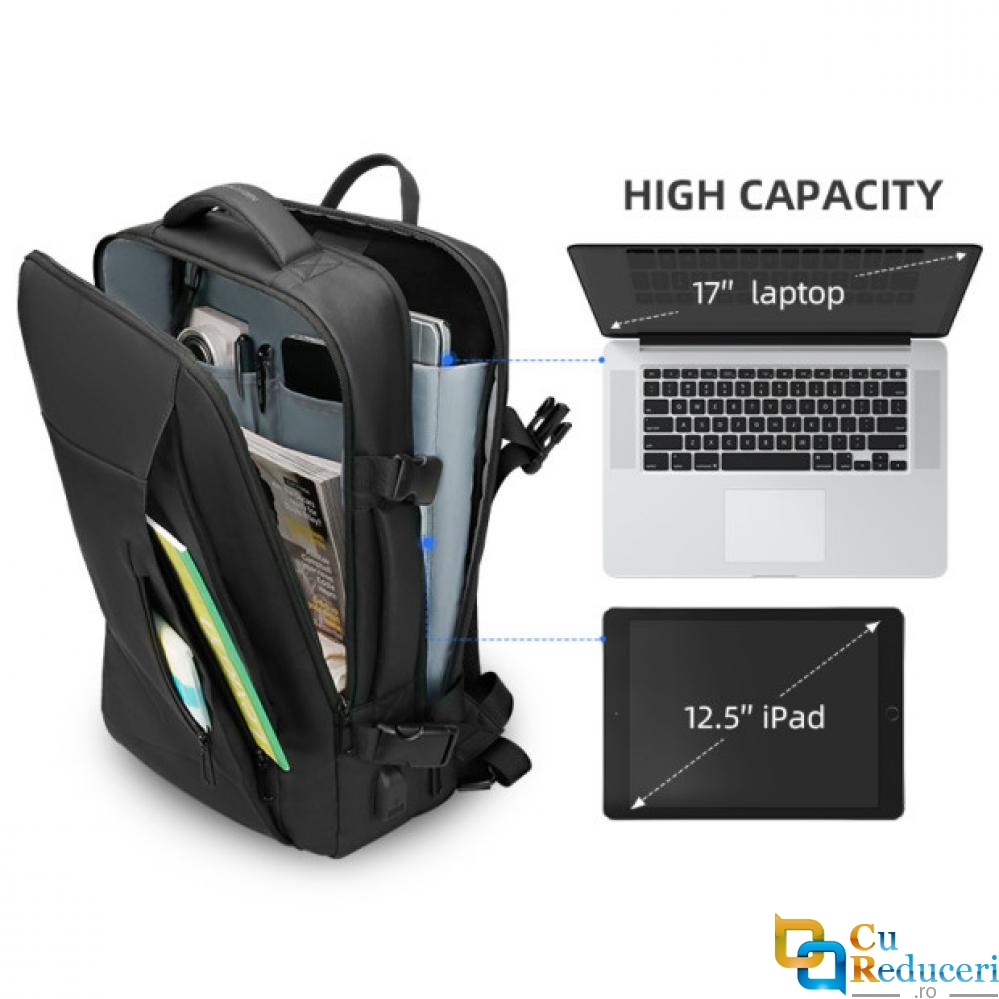 Exista doua compartimente in interior - primul compartiment este conceput pentru tehnologie si chiar un laptop cu diagonala de 17 inci se va potrivi acolo, o tableta iar al doilea compartimentul frontal este pentru lucruri. Exista, de asemenea, un organizator extern, buzunare, un port USB pentru incarcarea smartphone-ului in timpul deplasarii.