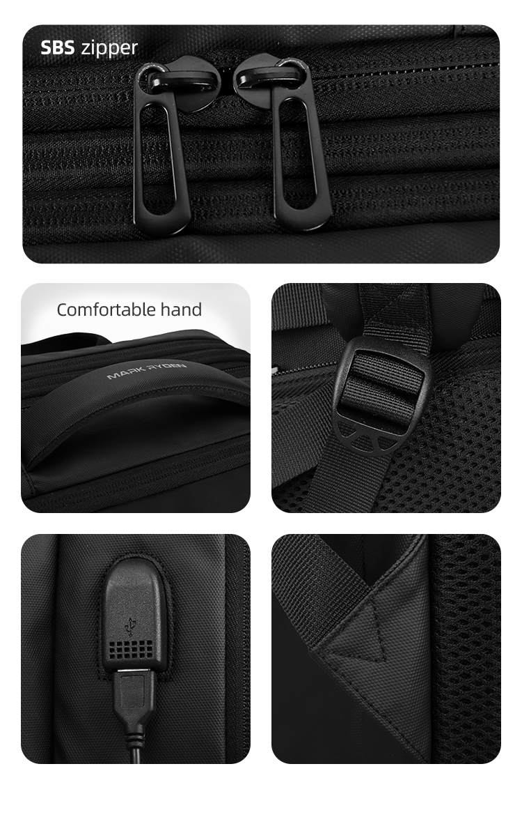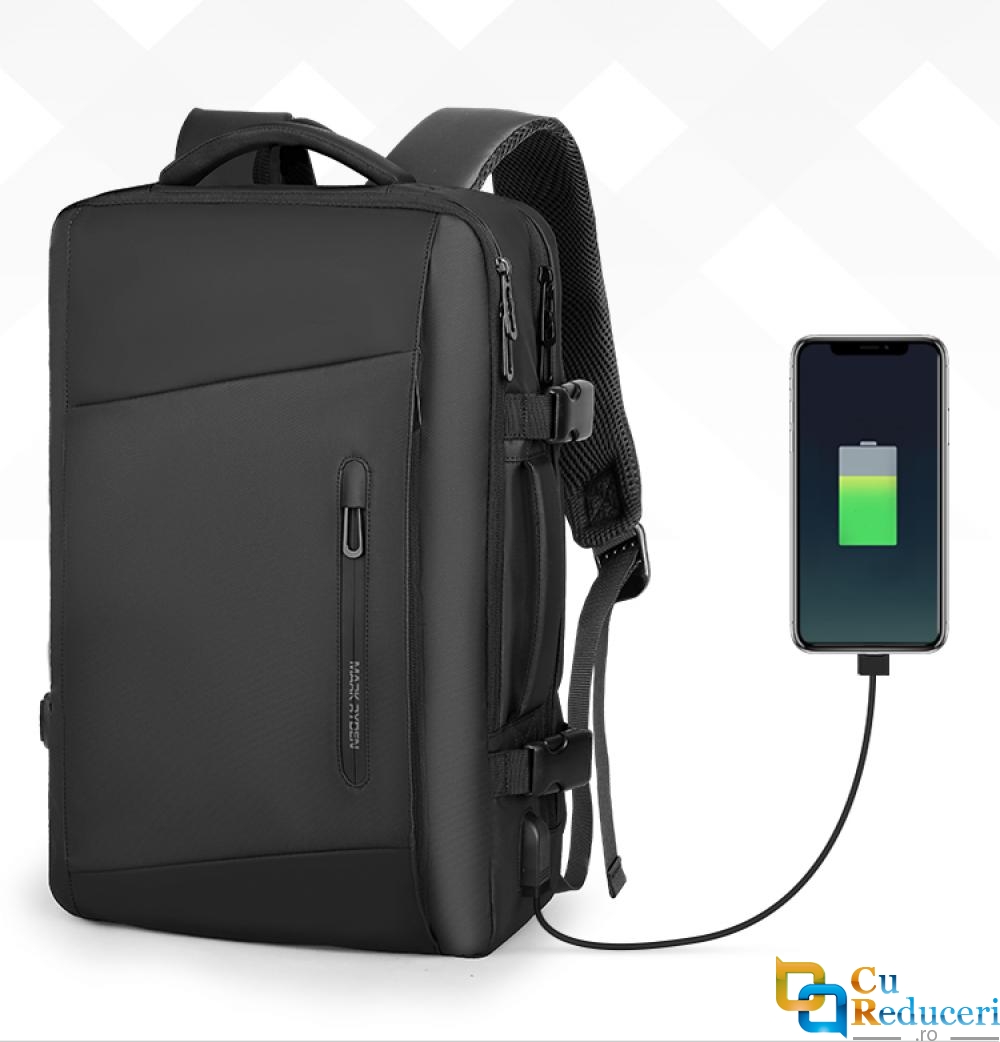 Port de incarcare USB - va permite sa va incarcati telefonul mobil atunci cand va deplasati. Rucsacul Mark Ryden Smart vine impreuna cu un cablu USB la care puteti conecta o baterie externa, un port USB la care puteti conecta cablul de incarcare al telefonului. In plus rucsacul are un buzunar captusit pentru laptop, ideal pentru laptopurile de 17,3” oferind astfelo acoperire remarcabila, de inalta calitate impotriva loviturilor de zi cu zi.