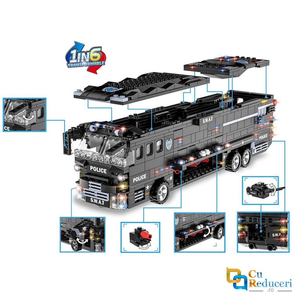 6 modele in 1 – Poate fi asamblat in 6 vehicule sau structuri diferite inspirate din echipele SWAT: masini tactice, vehicule blindate, transportoare si alte modele de interventie.