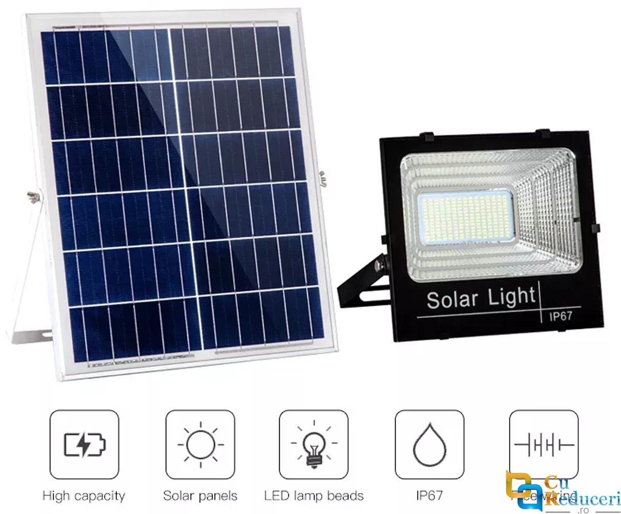 Proiectorul cu 106 LED SMD, putere de 60W beneficiaza de un panou solar cu ajutorul caruia se incarca direct de la soare, va ofera lumina cu autonomie de pana la 12 ore, sau in mod automat daca ati setat din telecomanda.