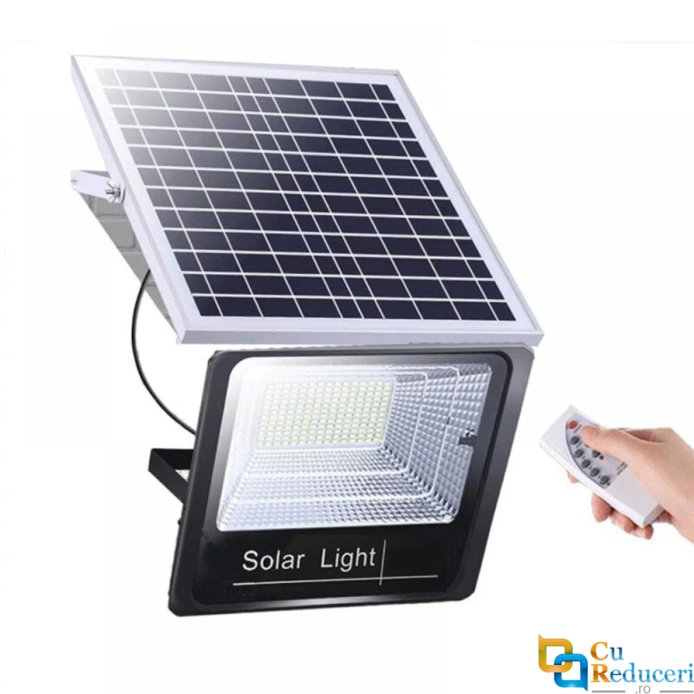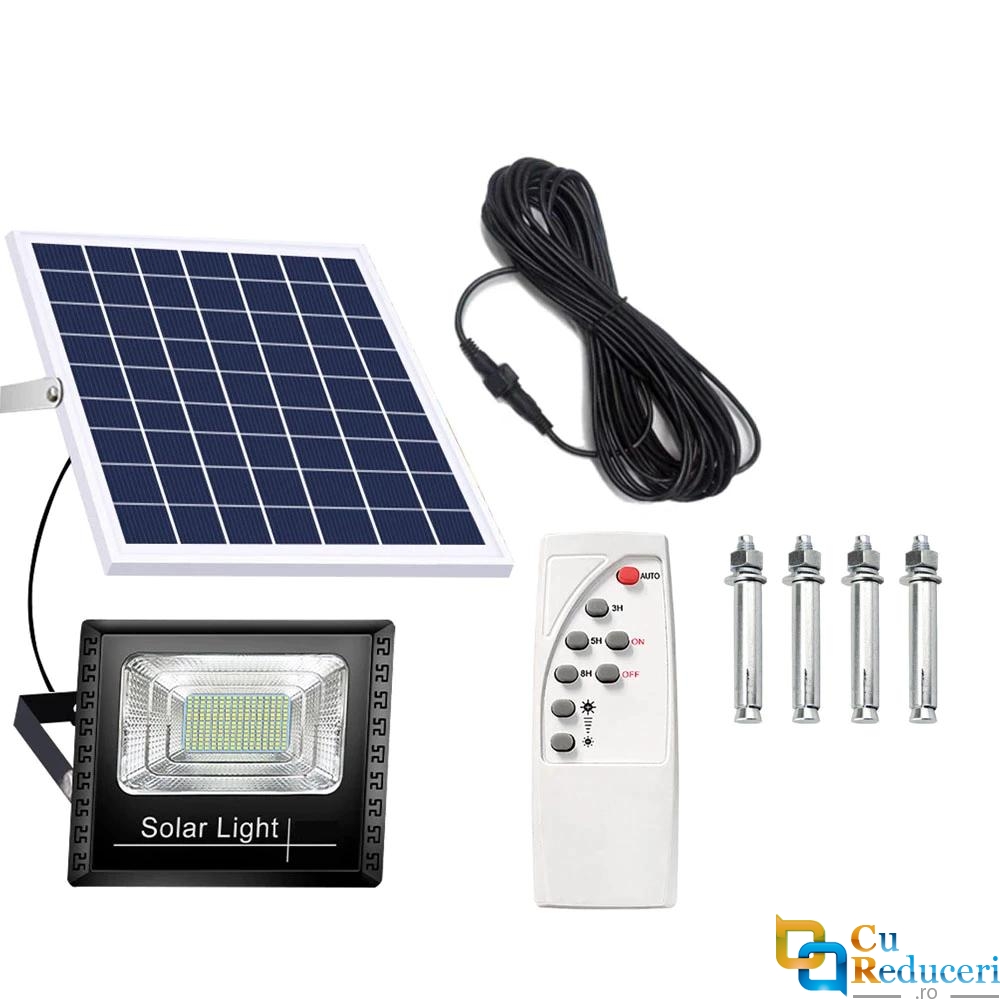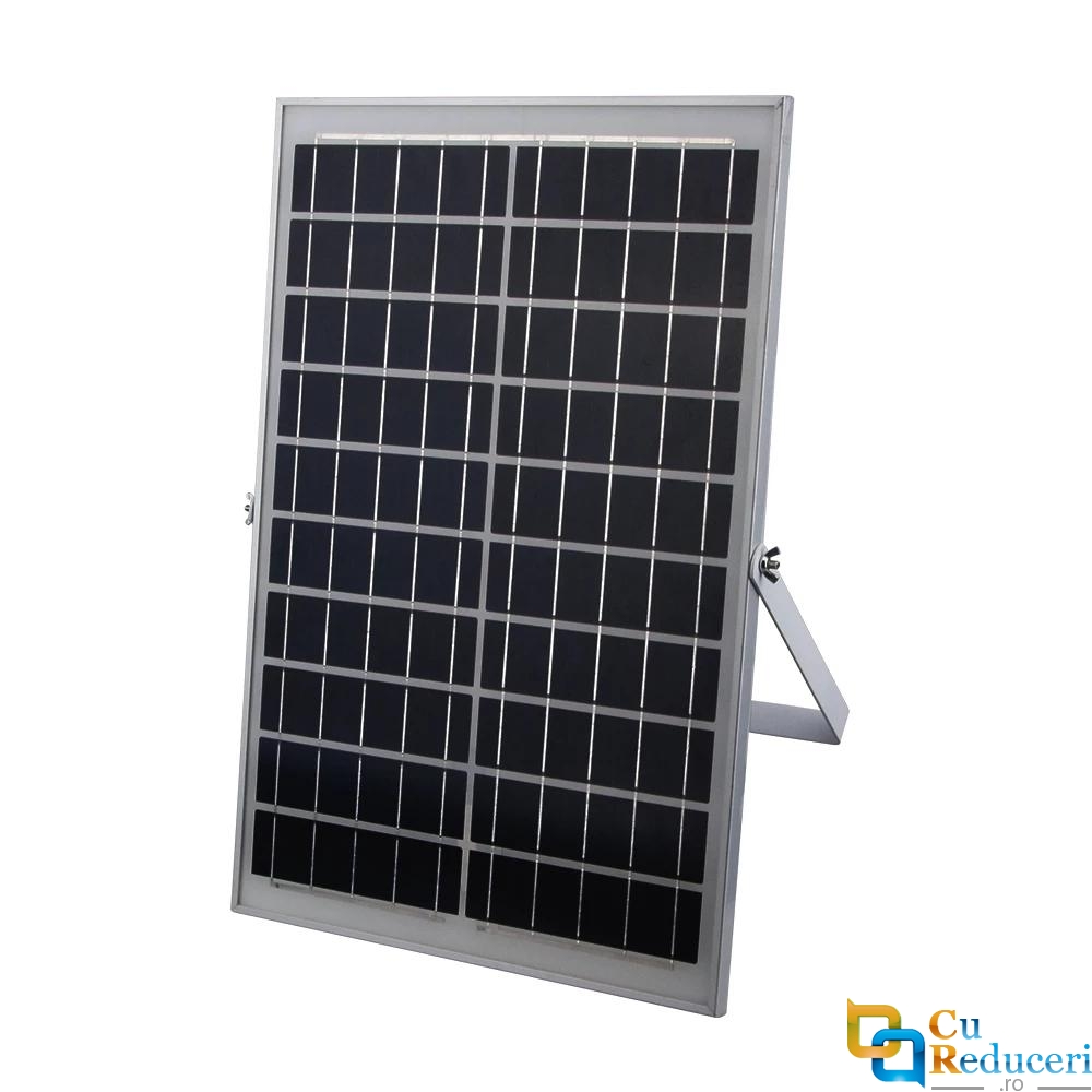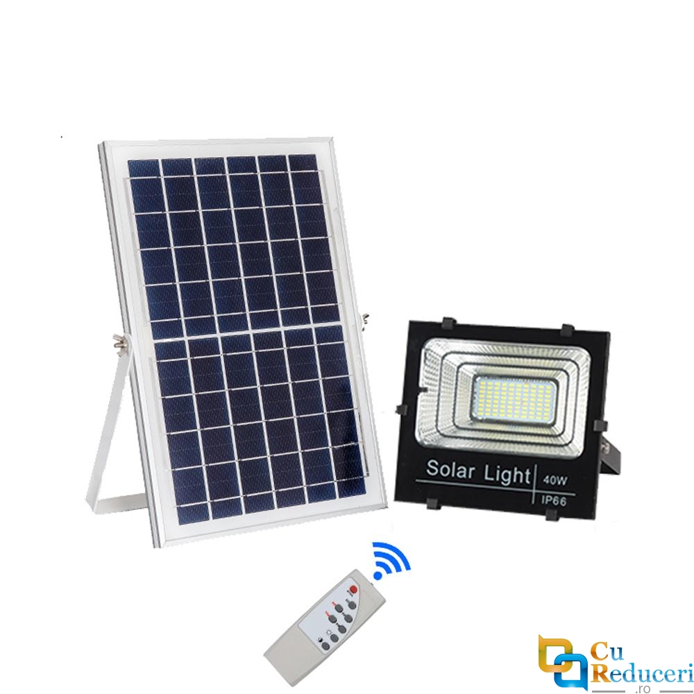 Proiectorul cu 72 LED SMD, putere de 40W beneficiaza de un panou solar cu ajutorul caruia se incarca direct de la soare, va ofera lumina cu autonmie de pana la 12 ore, sau in mod automat daca ati setat din telecomanda.