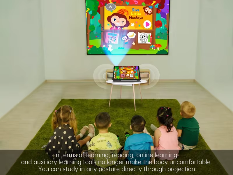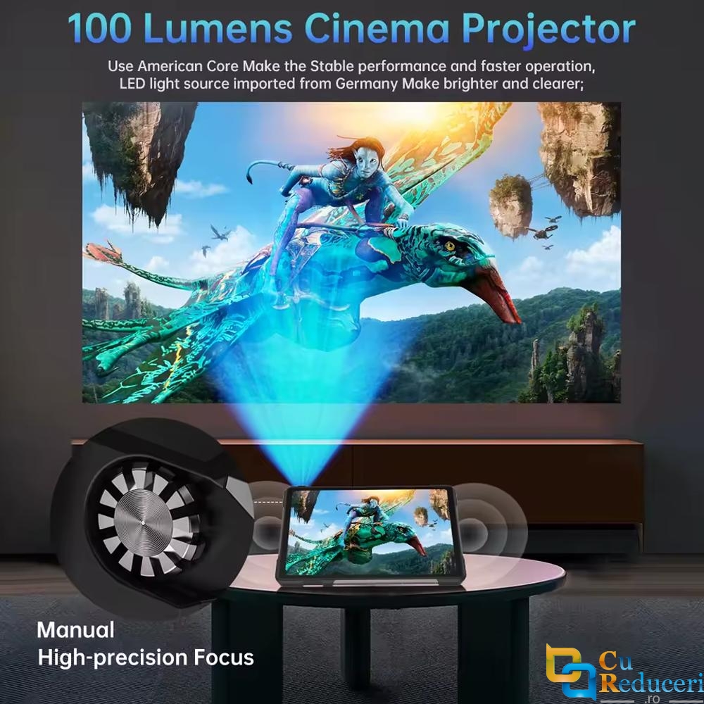Unul dintre punctele forte ale acestei tablete este proiectorul DLP integrat, cu luminozitate de 100 lumeni si frecventa de 120 Hz. Acesta permite proiectarea continutului pe distante intre 0.5 si 3 metri, cu focus manual si ventilator de racire dedicat, fiind perfect pentru prezentari, filme sau jocuri, oriunde te-ai afla.