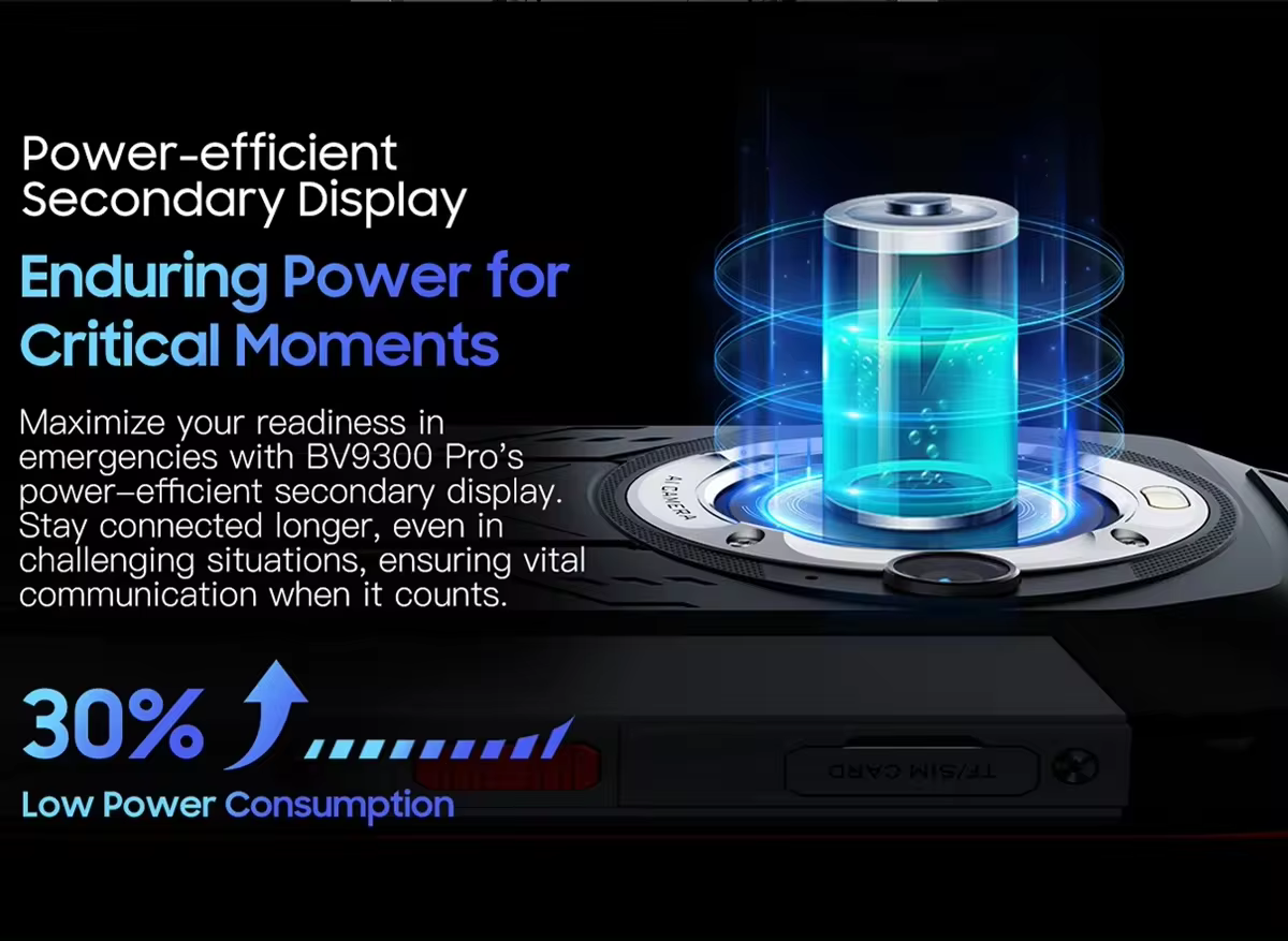 Cu o baterie impresionantă de 15080 mAh È™i tehnologie de încărcare rapidă 33W, BV9300 PRO te menÈ›ine conectat pe tot parcursul zilei, iar funcÈ›ia de încărcare reversibilă 5W îÈ›i permite să foloseÈ™ti telefonul pentru a încărca alte dispozitive în situaÈ›ii de urgență.