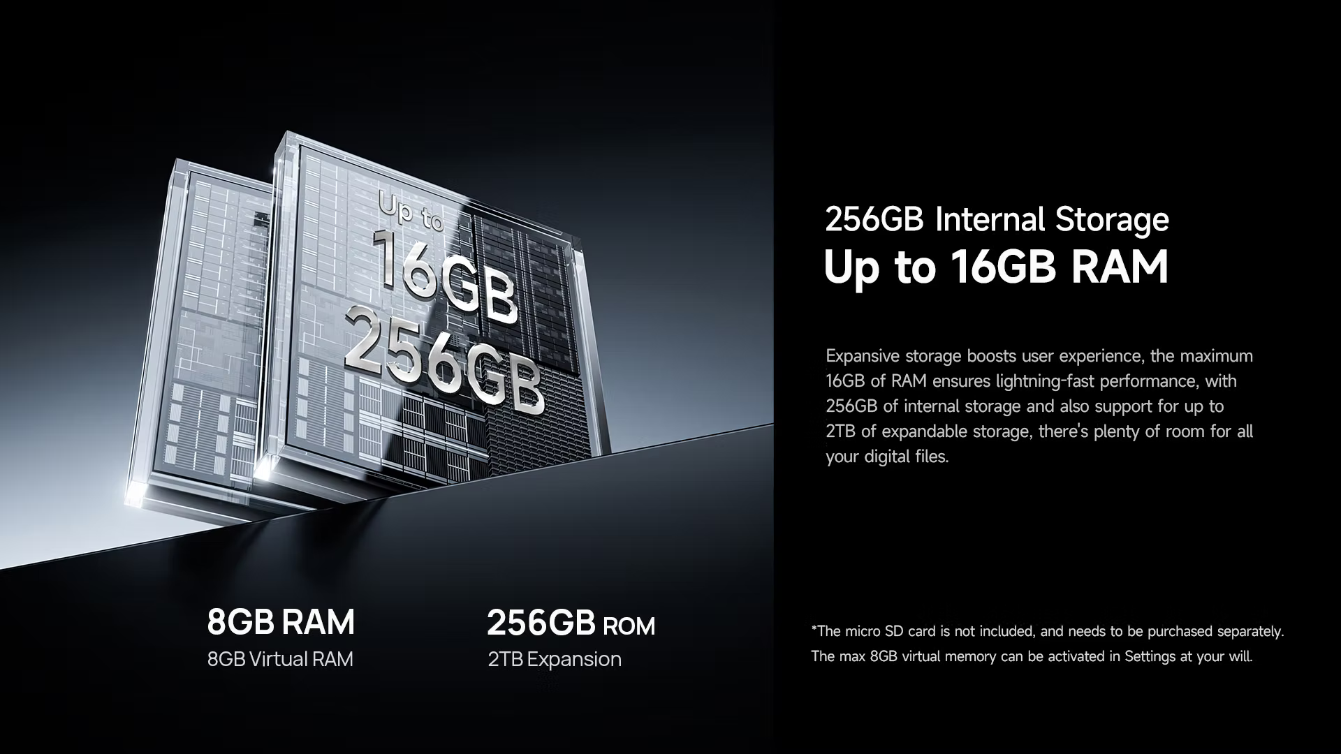 - Performanta ridicata cu 8GB RAM + 8GB extensibil si 256GB stocare – Asigura multitasking rapid si suficient spatiu pentru aplicatii si fisiere.