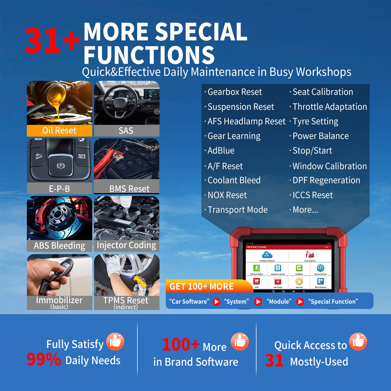 Launch CRP919X BT ofera o gama arga de functii avansate pentru diagnosticarea si intretinerea vehiculelor. Pe langa functiile standard OBD-II, acesta include peste 31 de functii de resetare si adaptare, menite sa faciliteze intretinerea si repararea eficienta a autovehiculelor. Iata o lista detaliata a acestor functii: